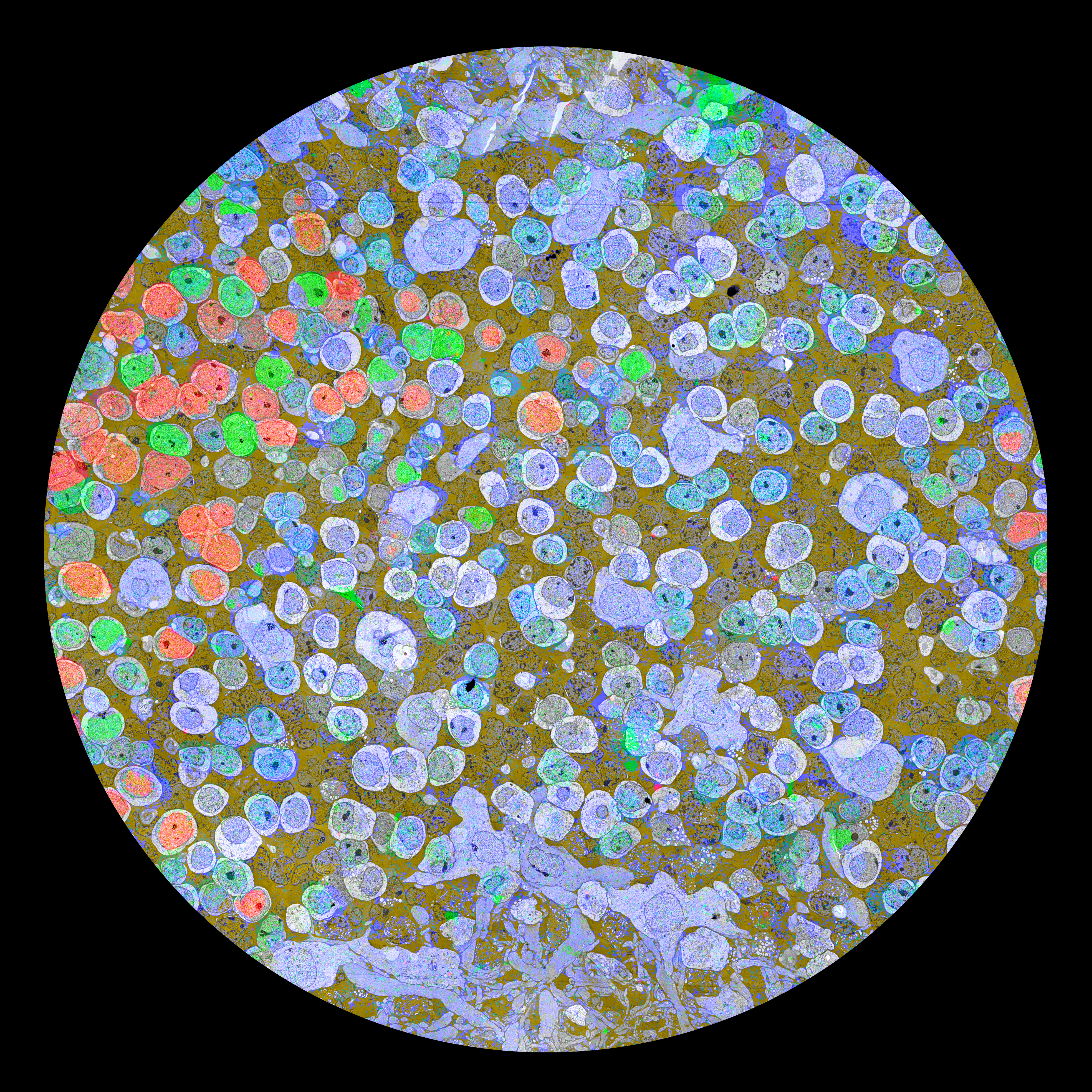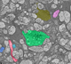 Caption: A keyframe image for a 90 section subvolume of retinal connectome RC1. RC1 is composed of over 340,000 transmission electron microscope (TEM) images from 341 sections spanning a 250 μm diameter tissue column, assembled into single analysis volume parsed by the Viking application. The subvolume, 17.8 μm wide with a native resolution of 2.18 nm/pixel, was designed as a public test volume for tracking algorithms. The six colored processes have different topologies that vary in tracking difficulty: yellow > green > red > lavender > blue > cyan. |