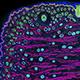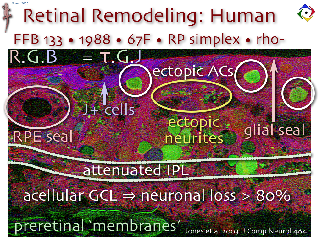 Human_remodeling (right-click or control-click and download)Advanced remodeling in the human retina: A fully labeled multispectral image (taurine=red, glycine=green, glutathione=blue) of human RP retina in advanced stages – the patient had been completely blind for decades. Full (1024 x 768) Keynote or Powerpoint resolution with LZW compression. This tissue bears no resemblance to retina nand was drawn from a dataset spanning 19 mm of retina. All was of similar disorganization.© REM 2005 |