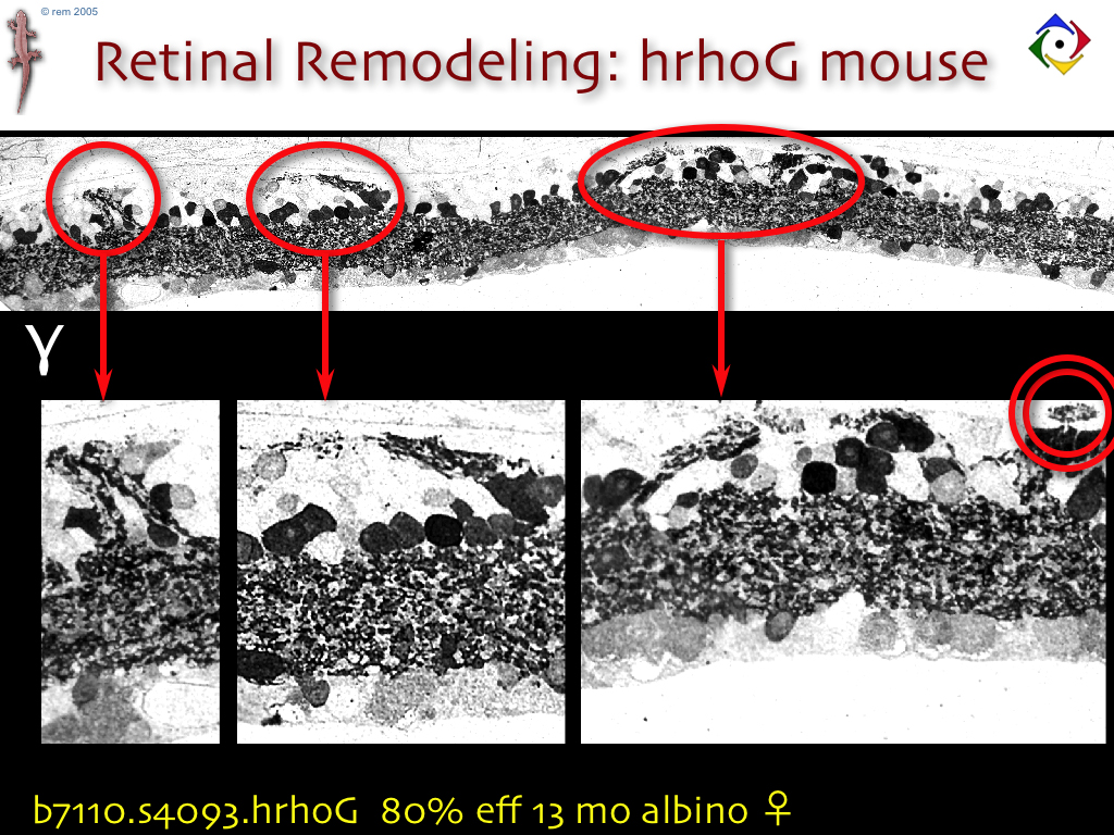 Microneuromas (right-click or control-click and download)Microneuromas: An image of GABA signals showing extensive microneuroma formation in the hrhoG degeneration model (*.tif) at full (1024 x 768) Keynote or Powerpoint resolution with LZW compression. Microneuromas are rewiring tufts of varying size: as small as 10 µm to over 200 µm. They are not visible in normal histological preps but with hi res, hi def immunocytochem, they are clearly profuse. In some rodents they are present at 10,000-30,000 / retina. That only includes the larger, more obvious ones. The double circled tuft is actually in the RPE layer, outside the retina.© REM 2005 |