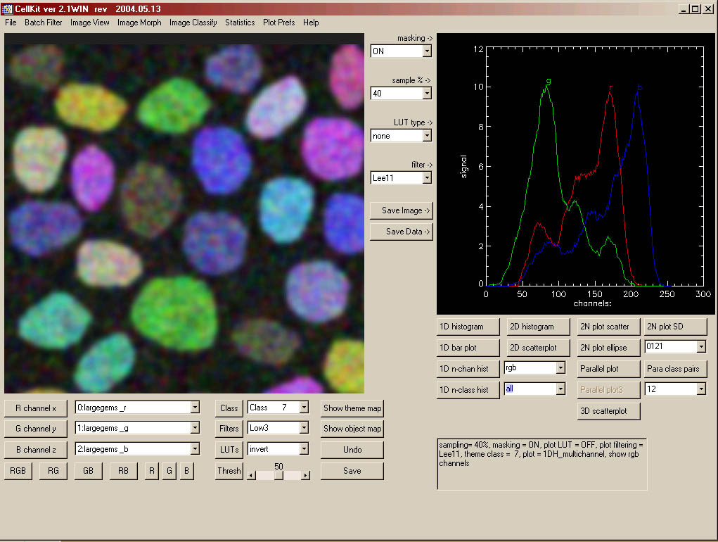 | CellKit (CK) is an application suite to explore classified or segmented images and visualize multivariate signatures of pre-aligned images such as multichannel datasets. CK was planned as a light-weight laboratory tool for our own biological research but is based on capabilities found in more powerful (and expensive) remote sensing application suites. The basic goals are to provide quick histogramming and classification tools for multichannel datasets. CK is early in its development (the interface and functions will undoubtedly change), but may be useful to those beginning their explorations of multichannel worlds. |