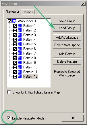 Make sure that the “Enable Navigator Mode” box is checked. Click “Load Group” and load 12_spot.oig. You should see 12 patterns listed. |